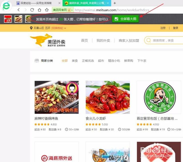 2. 测试批量保存网页图片。比如美团的网页,网址栏下面就会显示批量保存图片的提示条和按钮。