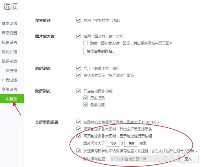打开设置后,点击“实验室”。按自己需要,勾选:“网页包含多张大图时,弹出全屏看图提示条”和“网页包含多张大图时,显示地址栏提示按钮”,然后设置下面“图片尺寸大于...像素”这里,最小的像素是150*100,你填大于这两个数字即可,当图片尺寸大于这个值时,网址栏下面就会显示保存图片提示条和相关按钮。也可以勾选下面的“快速保存图片时不询问保存位置”选择自己喜欢的文件夹位置。