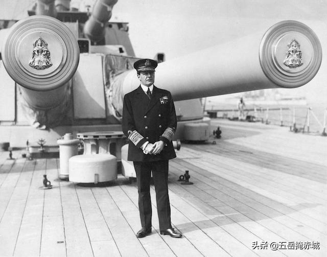 ▲贝蒂在日德兰大海战前在旗舰伊丽莎白女王号炮塔前照片,该舰炮口塞上蚀刻女王坐像。