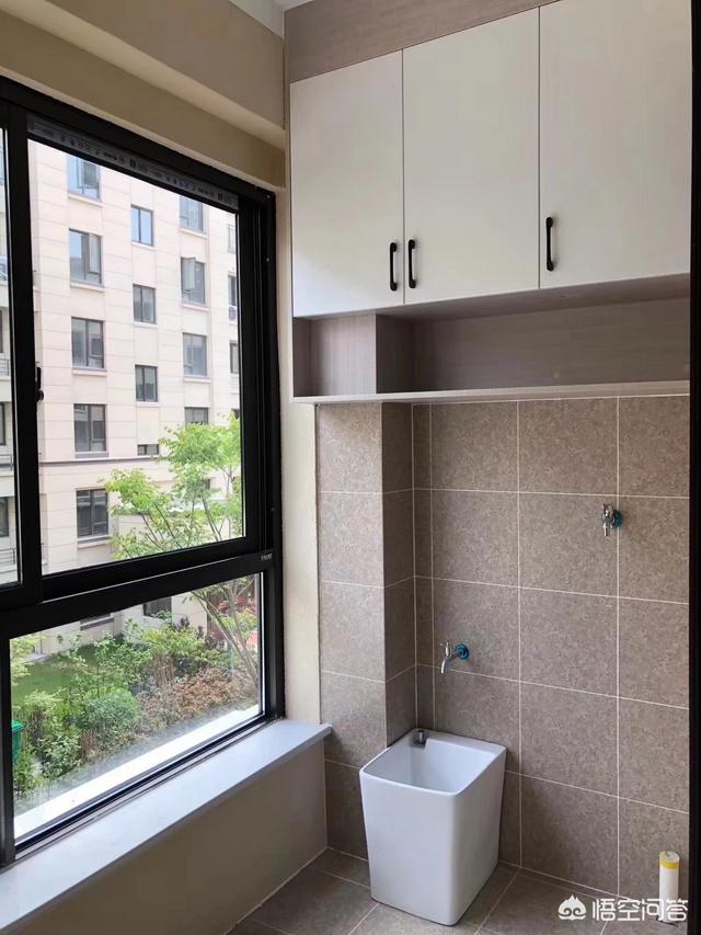 阳台的采光是非常好的,所以阳台也是作用生活阳台来使用,靠墙位置预留出洗衣机空间,同时做出了拖把池设计,方便平时在家收拾卫生使用,拖把池上面的小柜子是作为阳台收纳小物品的,柜子最下面的敞开隔板是方便平时放洗衣液和刷子等等随手用物品的。