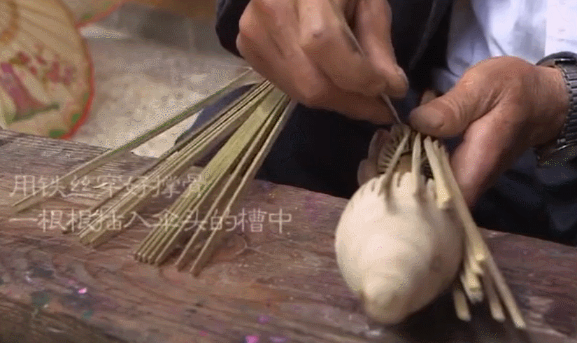 然后工匠依次把伞头、伞木顶和伞把拼接在伞柄上,在特定的位置对齐削出槽位和钻孔,用铁丝穿好撑骨,一根根地插入伞头的凹槽中。