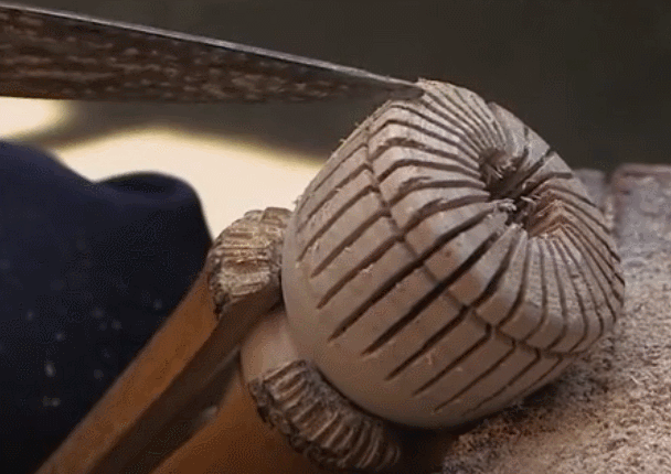 工匠将支撑伞面的长骨安插在伞木顶,定好位之后,把撑骨卡在槽里面。然后用线分别在每根相邻的撑骨和长骨的孔之间串起来,在长骨里每穿一根,还要绕线三圈来固定。这样,一个能伸缩张合的伞骨就基本做好了。