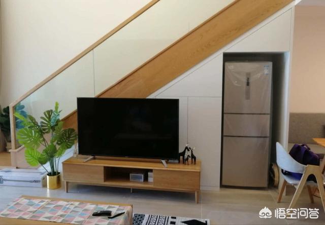 小户型的电视背景墙大多数都是利用楼梯的侧面墙,因为这样能将空间最大化使用起来,同时也很美观。电视背景墙的内部其实是收纳柜,也是楼梯的下面空间,这个空间是不能浪费的,所以做出了柜门的形式,方便使用。同时又将冰箱镶嵌到楼梯下面,而且是尺寸恰如其分,这样方便餐厅拿物品,又能装饰电视墙,实用又漂亮!