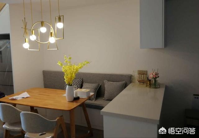 入户就是餐厅位置,虽然说没有玄关,但装修时还是很巧妙的做出了玄关的设计,在入户位置正前方预留出1.2米的空间,然后做出一个玄关的设计,玄关下柜是作为鞋柜来使用,上柜是作为收纳来使用,考虑到入户位置的采光,所以玄关位置做成了中间通敞的设计,而且上柜只做了半柜的设计,这样入户位置亮度增加的同时又增加美观效果。餐厅做出了卡座形式,这样不占用空间的同时又保证了餐厅的实用性,看着就很高兴。