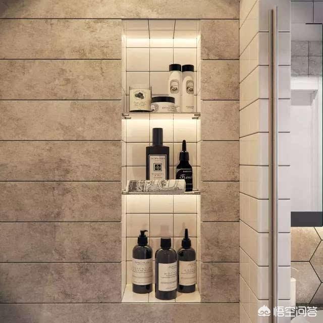 ③嵌入式壁龛:传统卫生间收纳都是用置物架。它需要占用一定空间,还不能放太重的东西,功能比较单一。那么在小卫生间里就可以做嵌入式壁龛了。壁龛就是在除了承重结构墙其他的墙上凿洞,用瓷砖在墙里砌出一个置物架。这种做法不仅美观还非常实用,还不占用空间。