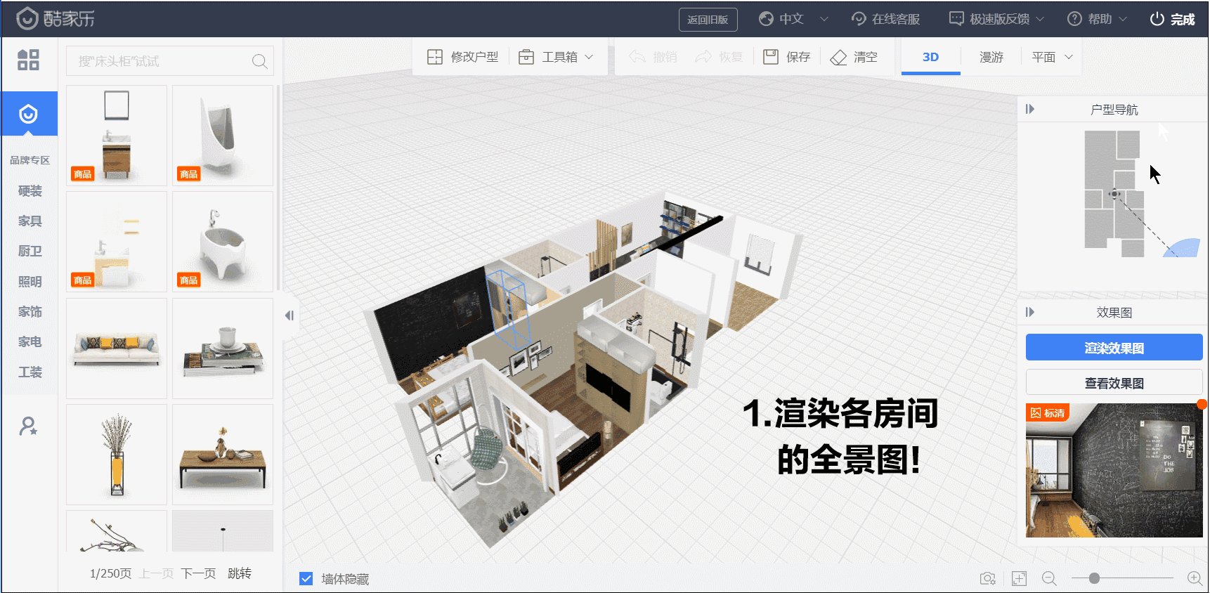 7、效果图产出;酷家乐云设计支持产出效果图,真正所想即所得,还支持产出全景俯视图,整体设计一目了然。更有全网唯一的360度全景浏览,亲临现场体验设计方案的感觉。