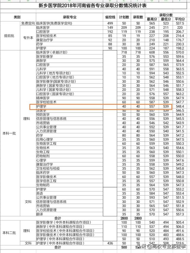 新乡医学院护理专业不单列,录取