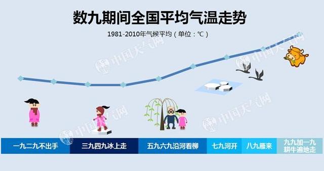数九歌大致描述了数九期间我们国家大部分地区的气温变化规律——一九二九,天气持续变冷;三九四九,我国大部地区迎来一年中最冷的一段时间,北方河流冰封;五九六九,天气开始逐渐回暖,南方柳树开始发芽;七九,北方河流逐渐解冻;八九,飞往南方越冬的大雁北归(也有一说是燕子归来);九九,南方开始春耕。