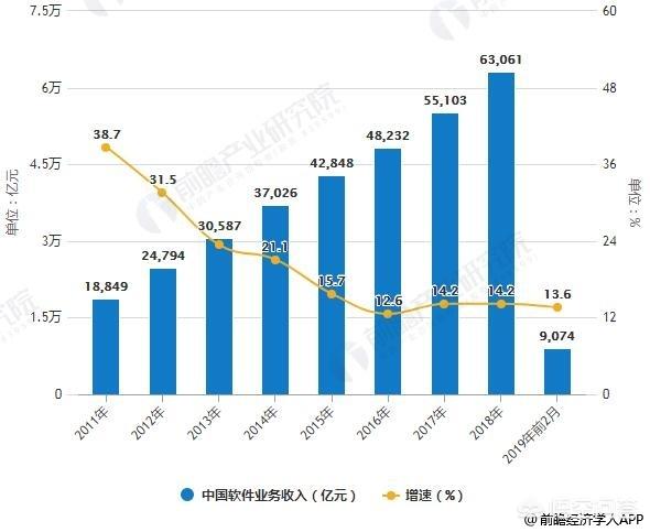 据前瞻产业研究院发布的《中国软件行业市场前瞻与投资战略规划分析报告》统计数据显示,截止至2018年底,全国软件和信息技术服务业规模以上企业3.78万家,比上年增加2881家,累计完成软件业务收入63061亿元,同比增长14.2%。进入2019年1-2月,我国软件业完成软件业务收入9074亿元,同比增长13.6%,增速同比提高0.3个百分点,实现良好开局。