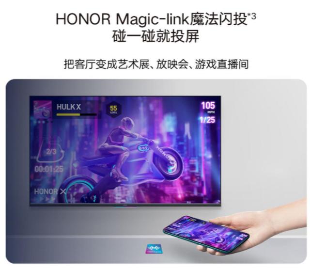 其次,在操作系统上,荣耀智慧屏首次搭载鸿蒙系统性能大升级。搭载了鸿蒙操作系统的智慧屏,可以使各智能家居设备互为外设,分布式协同能力大大增强。手机和智慧屏之间可以无缝连接,信息共享。在观看影片时,只需要打开手机上的智慧屏APP就可以像遥控器那样操控智慧屏。另外,依赖于鸿蒙系统超低的延时性,像王者荣耀等手游都可以投屏玩,低延迟仅50-100ms,并且不用额外安装任何软件,因为智慧屏具有魔法闪投功能,只需要将手机贴近NFC芯片所在位置,手机上的画面就可以自动传输到智慧屏上,非常流畅。