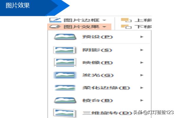 点击图片,图片工具(格式)-图片效果对图片进行设置,如下图,设置三维旋转。