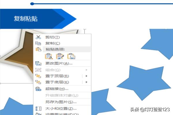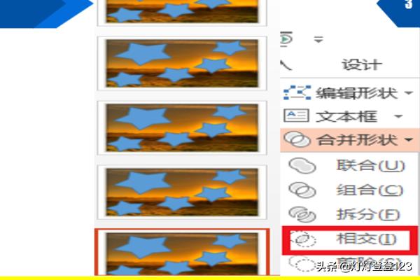 对上面制作的幻灯片进行复制备用,先选中图片,按住Ctrl,选中五角星,然后绘图工具(格式)-合并形状-形状相交。如图所示,通过形状相交得到的图片不容易变形,且可以随意保留图片的任意部分,