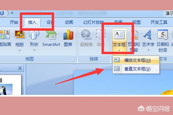 4、插入了图片之后,在PPT里面点击插入下面的文本框工具,选择横排或者竖直的文本框。