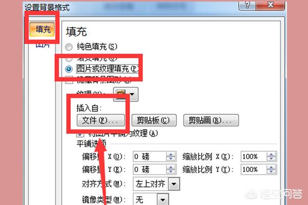 2、然后在填充下选择图片或纹理填充,在插入里点击文件。