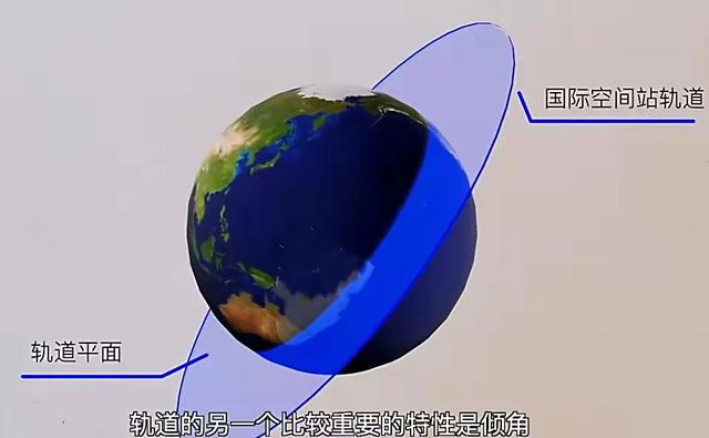 飞船绕地飞行一般都是安装一个固定轨道,这个轨道所处的平面一般都穿过地心,轨道一般都是椭圆形。椭圆轨道有近地点和远地点。而国际空间站的轨道近地点、远地点到地心距离只差18千米左右,非常接近于正圆形。轨道和另一个特别重要的特性是倾角。它是指以赤道平面为基准。国际空间站的轨道平面它的倾角是51.6度。