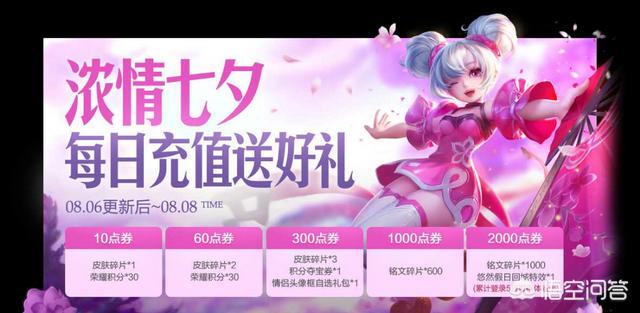 七夕节的第四个活动:浓情七夕充值送好礼活动,这一次和上一次的活动有点不一样,那就是当你达到了2000点券的时候你可以拿到1000名文碎片,还可以拿到一些皮肤碎片,但是最重要的是一个专属的回城特效,因为大部分玩家只能拿到一个五日的体验卡!