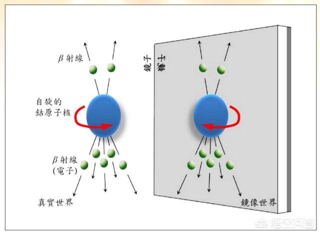 吴健雄等人最早用实验验证了杨振宁和李政道的猜想。吴健雄采用的是被极化后的钴原子核发生β衰变时释放电子的方案,如上图所示,左边被极化的钴原子核主要是向下释放电子,那么在镜像世界中,原子核自旋方向颠倒后钴原子核仍然会主要向下释放电子。然而实验观察到的现象却不是这样的。实验中钴原子核向下掷电子,镜像世界中的钴原子核却向上掷电子,镜像对称破坏了,这意味着弱相互作用下宇称真的不守恒。