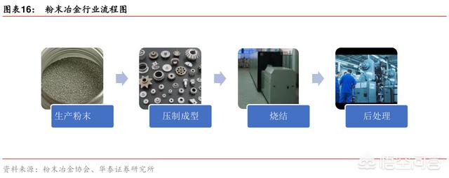 粉末冶金过程主要包括:1)生产粉末:通过固态还原,化学,雾化和电解等方式来制造粉末;2)压制成型:粉末在一定压力下,在磨具中压制成所需的形状;3)烧结:在保护气氛的烧结炉中进行,粉末颗粒通过扩散、再结晶、熔焊、化合、溶解等系列物理化学过程,行程具有一定孔隙度的冶金产品;4)后处理:烧结好的制件,通过打磨、抛光、挤压、淬火等方式进行后处理加工,得到成品。