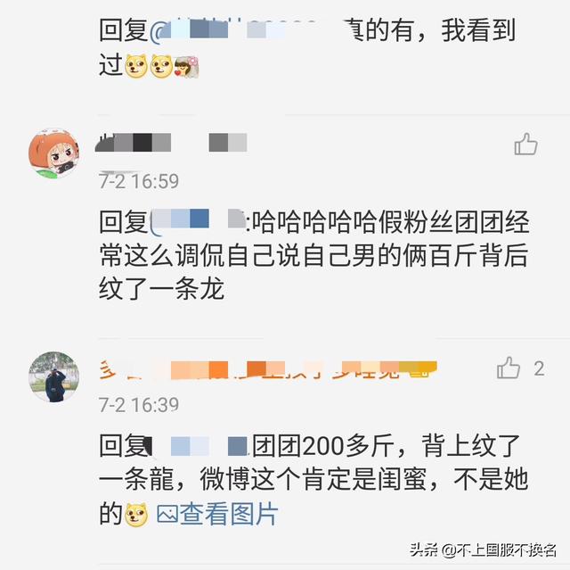 当然也有人认为团团的发的这张照片是她闺蜜的,才故意把头遮盖,真正的团团是200多斤,身后还纹了一条龙。