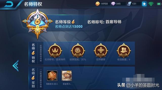 但是在名师等级达到6级的时候就可以得到一个永久的圣诞老人皮肤和一个5级铭文圣人 在游戏界面上点击自己的头像--师徒信息--师徒系统--名师特权。
