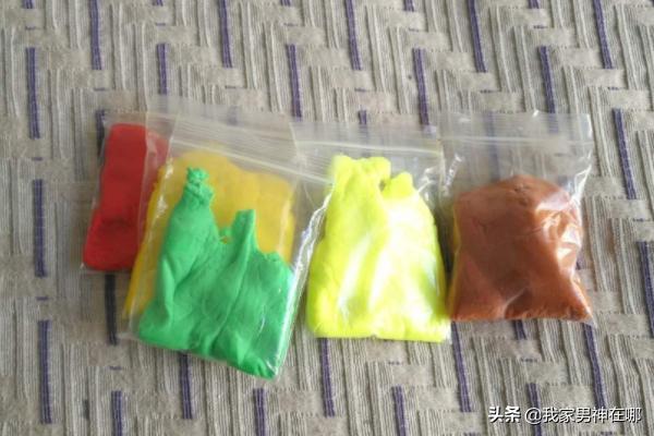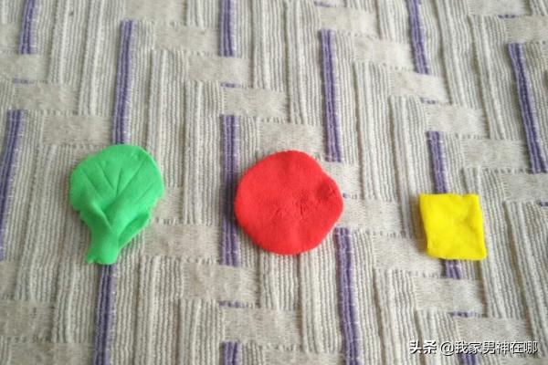 4、用绿色和红色粘土分别做成生菜叶和火腿肠的形状。