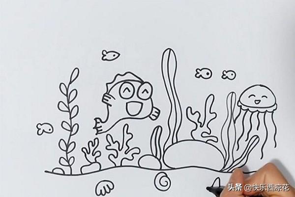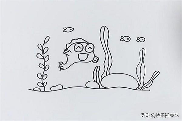 2、然后在下面画一条地面,慢慢的画出一些不同的海草和石头,再画几条小鱼在旁边游来游去。