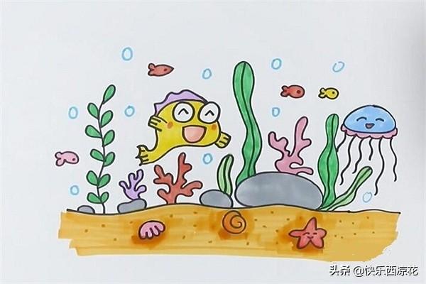 4、给海草涂上绿色,石头涂灰,海草和鱼儿涂上不同颜色,海底涂上棕黄色,最后画上蓝色的气泡,好看额海底世界就完成啦!