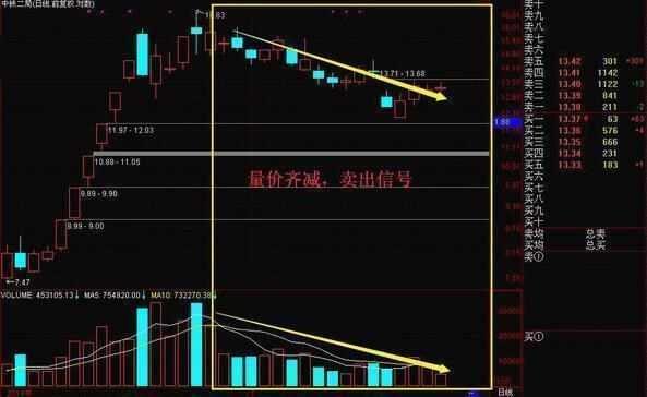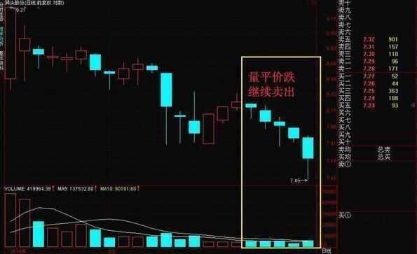 成交量继续减少,股价趋势开始转为下降,为卖出信号。此为无量阴跌,底部遥遥无期,所谓多头不死跌势不止,一直跌到多头彻底丧失信心斩仓认赔,爆出大的成交量,跌势才会停止,所以在操作上,只要趋势逆转,应及时止损出局。