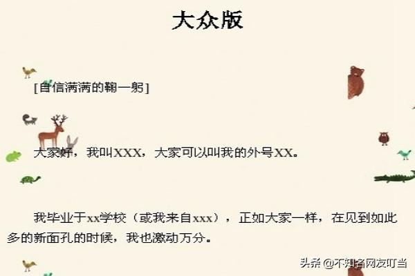 拓展资料:自我介绍是每一个职场中人都必然要经历的一件事情,只不过,有的人一年用不上几次,而有的人则一个星期可能需要做N次。众所周知,自我介绍是日常工作中与陌生人建立关系、打开局面的一种非常重要的手段,因此,让自己通过自我介绍或得到对方的认识甚至认可,一种非常重要的职场技术。