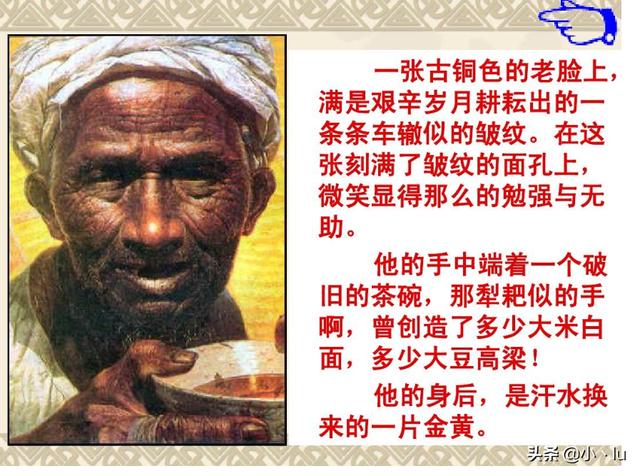 这位老汉的眉毛胡子都花白了。但脸膛仍是紫红色的,显得神采奕奕。他身穿崭新的青布棉袄棉裤,头上还包着一块雪白的毛巾。老汉蹲在地上,乐滋滋地抽着旱烟。