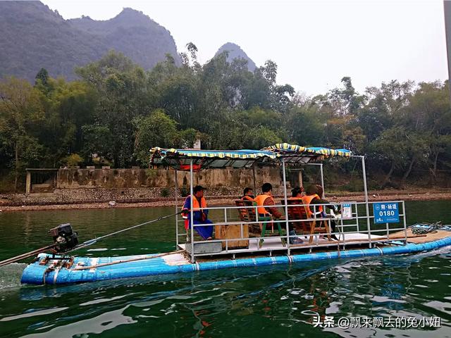 大巴车定点定时接人,直接拉到码头乘坐竹筏。竹筏沿漓江漂流,4人一船,漂流时间比较长,两边的景色很美。