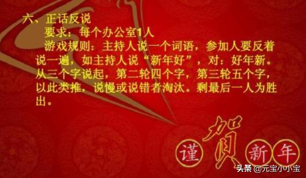 选几个口齿伶俐的人参加游戏,主持人要事先准备好一些词语。主持人说一个词语,要参加游戏的人反着说一遍,比如“新年好”,游戏者要立刻说出“好年新”,说错或者猛住的人即被淘汰。从三个字开始说起,第二轮四个字,第三轮五个字,以此类推,估计到五个字以上的时候游戏者就所剩无几了。