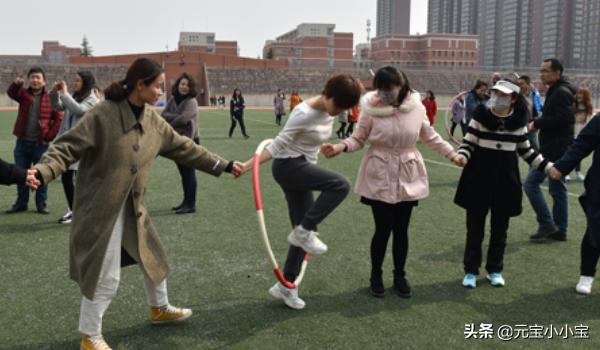 这个游戏要较大的场地和较多人参加,恐怕也不是特别适合。若干人一组,手拉手围成一个封闭的圆圈,在其中一人手臂上套上一个呼啦圈,比赛开始时,各小组同时运动,在不许用手的情况下,把呼啦圈穿过每个人的身体,最后传一圈,最先完成的一组胜出。呼啦圈不能太大,否则穿越的时候太容易,也不能太小,让大家都穿不过去。