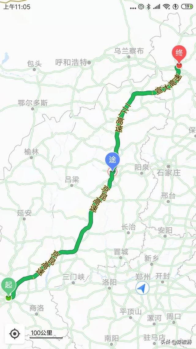从西安出发途径→京昆高速→山西市→二广高速→孙右高速→京大高速→张石高速→到达张家口市