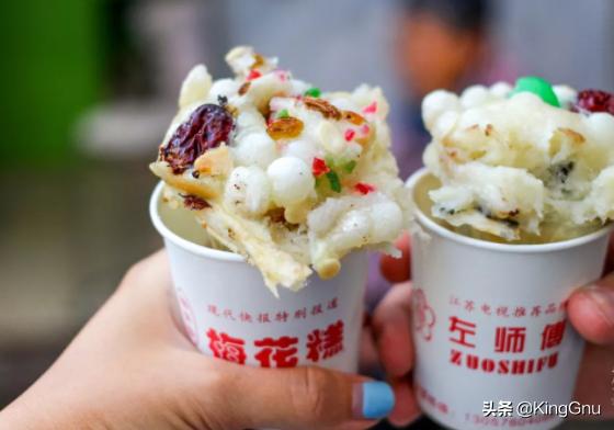 南京的梅花糕和别的地方不同,在梅花糕制作的基础上加入元宵、青红果、松子仁等,是其味道更加丰富美味。梅花糕造型逼真如梅花,颜色金黄,松软可口,里料丰富,老少皆宜。