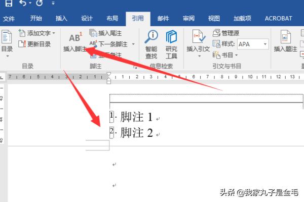 3、同样的方法,在尾注左边有一个插入脚注1、2.同样的,在此图中可以看出脚注和尾注的区别来。