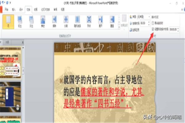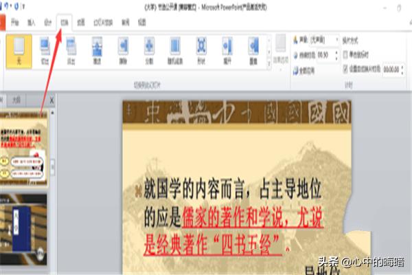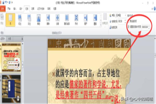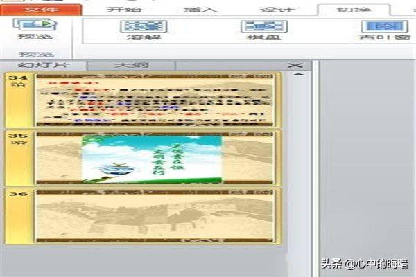 选择完幻灯片后在菜单栏里面找到“切换”,在最右边可以找到切片方式。选择第二个:设置自动换片时间,自己调整想要的时间。