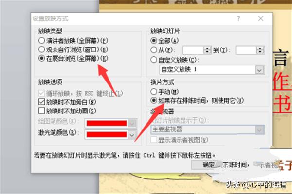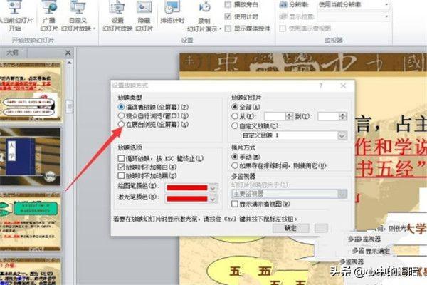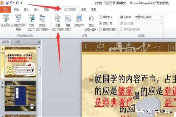 在菜单栏幻灯片放映里面选择设置幻灯片放映。