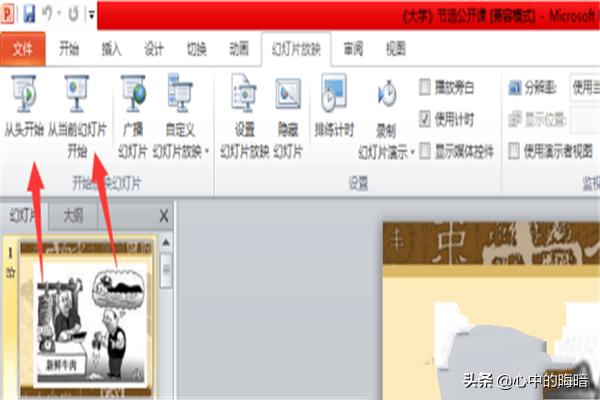 最后放映幻灯片测试一下就可以了。可以在菜单栏里面选择放映方式,也可以选测右下角的快捷图标。