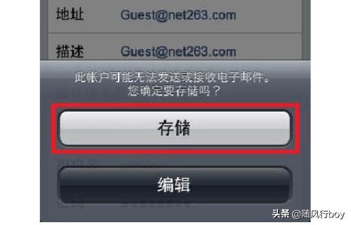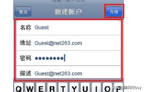 3、进入之后可以看到设置界面,输入“名称”(任意填写)、“地址”(写完整的邮箱地址guest@net263.com)、“密码”(填写邮箱账户的密码)。“描述”项自动生成,可自行修改,描述项所填写的内容即为邮件帐户所显示的名称。填写完成后,点击右上角的“存储”。