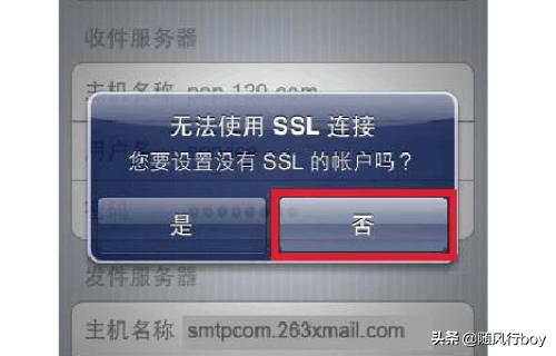 5、填写后点击“存储”,等大约1分钟左右,手机屏幕会跳出SSL连接的提示,点击“否”。