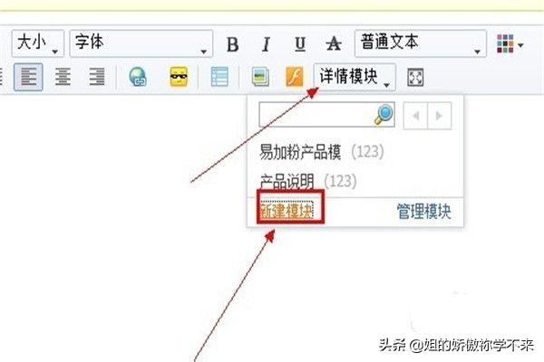 2、鼠标移动到详情模板上面,然后在出现的下拉菜单中选择“新建模块”,下图所示。
