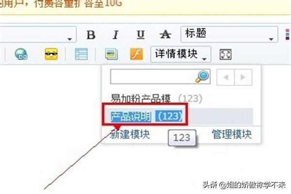 5、下一次回到宝贝描述页面后,鼠标移动到详情模块,在下面出现的菜单中,选中编辑好的产品模块,即可在产品描述框中快速出现产品的信息。