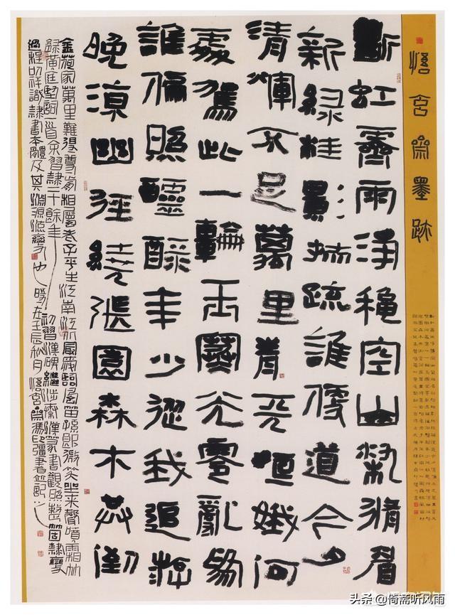 第一张,原谅我着实看不懂好在哪里。从字形和章法布局来看,作者肯定有练过书法,但从笔画上看,基础似乎一点都不扎实,明显运笔不稳。字的笔画里带有隶书和篆书的写法,大概这就是所谓的创新吧!