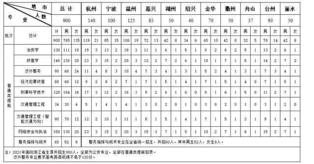 浙江警察学院2021年浙江省分专业招生生源计划