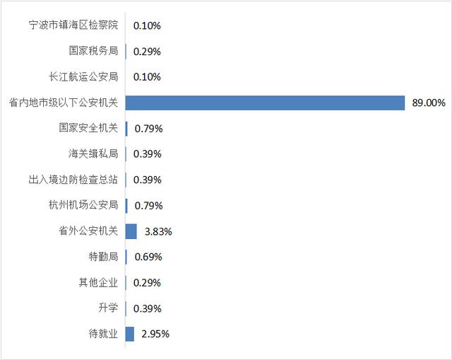 浙江警察学院2020届毕业生共计1018人,均为本科毕业生,其中浙江省生源毕业生984人,西藏自治区生源毕业生31人,上海市生源毕业生2人,安徽省生源毕业生1人。截至2020年12月25日,学校总体就业率为97.05%。