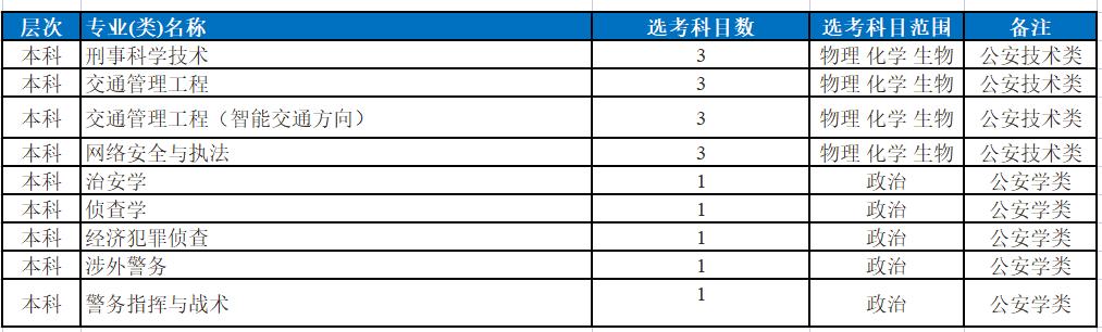 特别强调说明五点:1、公安学类专业必须选考政治;公安技术类专业选考物理、化学、生物中一门即可。