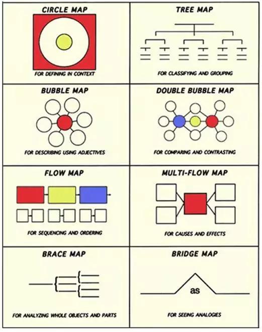 是啊,我们教孩子识字、算数、陪孩子练琴、运动,但思考怎么教啊?后来,随着逃逃在这边上学和我对美国课堂的观察了解,发现还真的能教,而且老美已经教了20多年。这得归功于一位叫David Hyerle的教育学博士,他在1988年整理出8种 Thinking Maps(思维导图),彻底帮大家把思考这门“课”搬进了课堂。