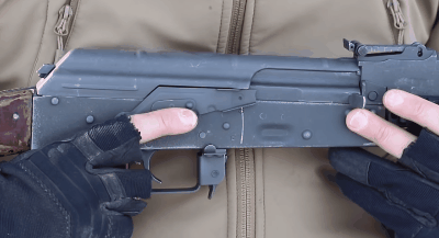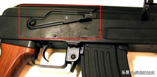 AK的保险不在拇指上方,而是在机匣右侧扳机上方,这个大拨片子可以用食指和中指去拨,如图所示,拨到最上方与机匣盖呈封闭状是保险状态