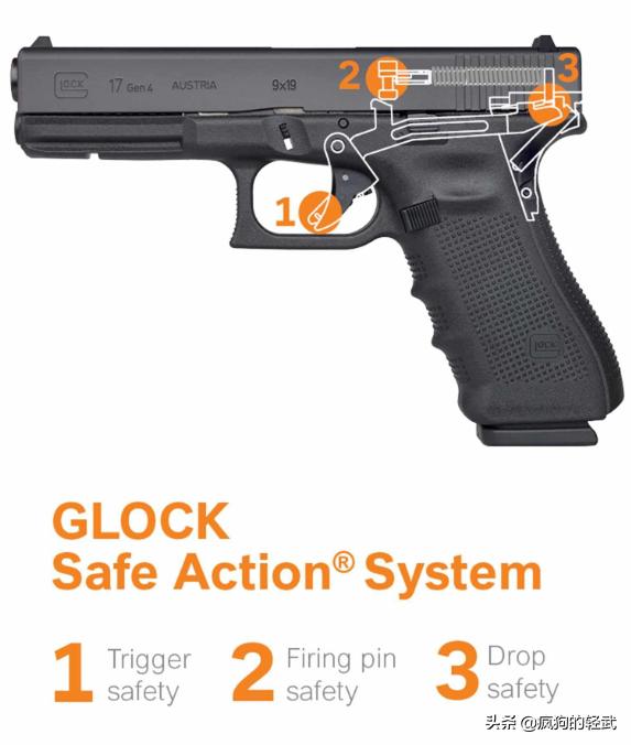 格洛克的扳机保险现在越来越流行,它枪身上没有任何凸起的保险杆,而是将扳机保险、击针保险、防跌落保险都整合到了扳机系统上。只要扳机不触发,击针保险和防跌落保险都是安全的,而要触发扳机,则得扣动连同扳机上的那片小扳机保险才能击发。这种设计对不咋训练的人而言很友好,遇到紧急情况掏出来就射,不用和别的手枪一样还得想想保险在哪儿